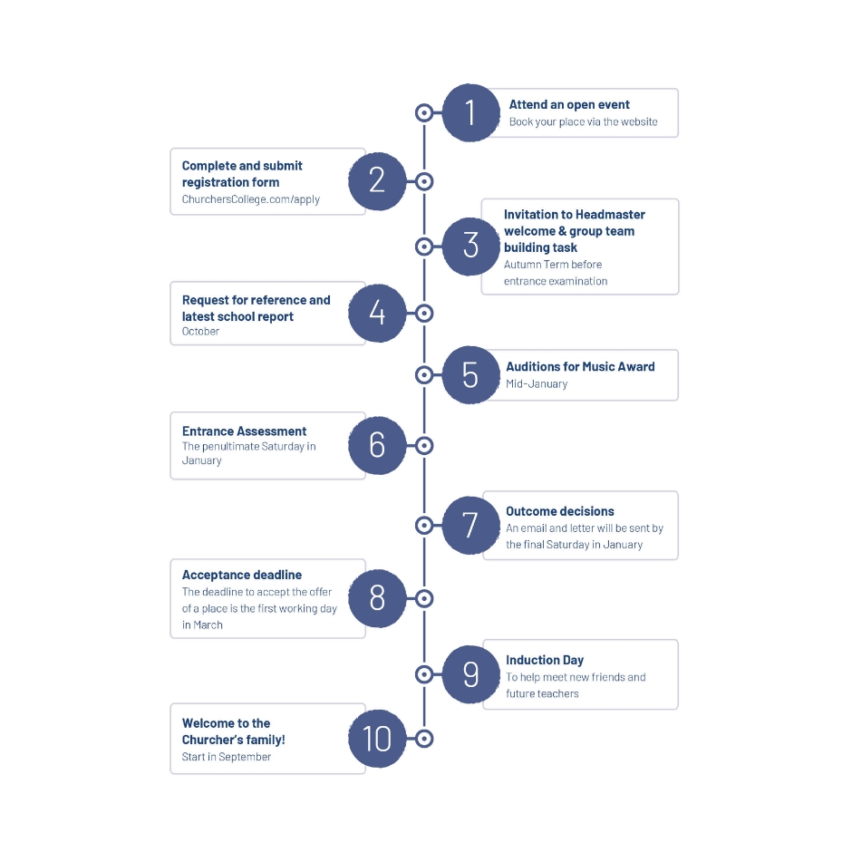 An application for your child to be included in our entrance assessment procedures should ideally be submitted over the summer between Year 5 and Year 6. Although there is no deadline, we encourage early registration but no later than October Half Term.