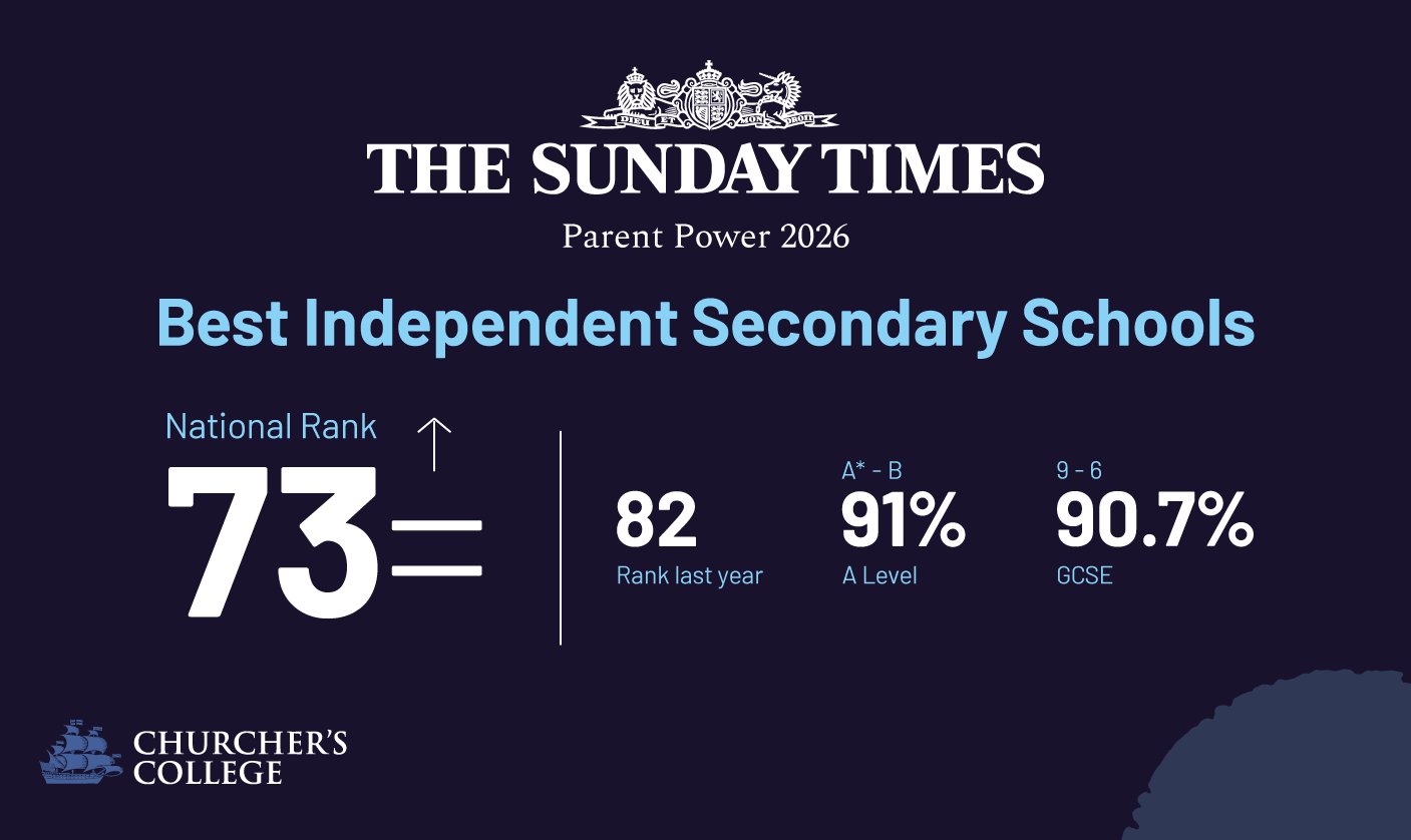 Churcher’s College is ranked the UK’s 73rd Best Independent Secondary School in The Sunday Times Parent Power League Table 2026, and is recognised as the leading co-educational independent school in Hampshire.