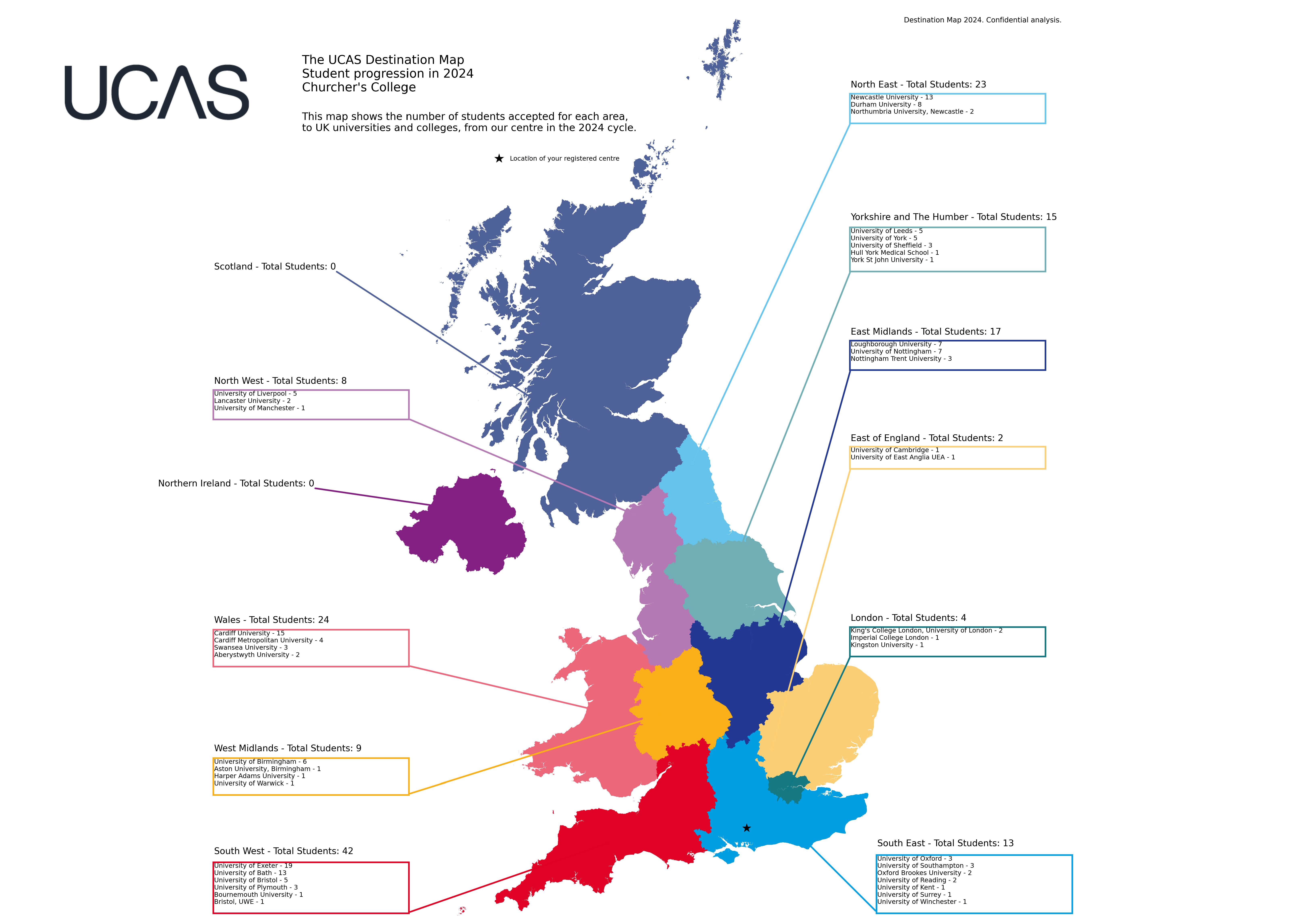 This map shows the number of students accepted to UK universities and colleges from Churcher’s College in the 2024 cycle. The most popular university destinations are Nottingham, Durham, Cardiff, Bath and Loughborough. Click the map to enlarge.